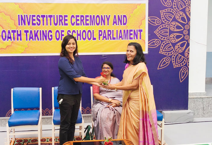 To honor the new leaders, the teachers dedicated a heartfelt wishing song. Dr. Mrs. Bhavyashree Kidiyoor extended her congratulations to the newly appointed student council and inspired them to lead with sincerity and accountability.