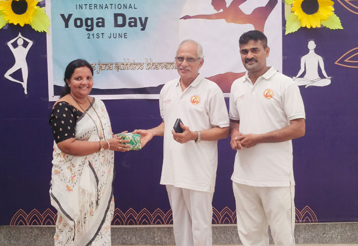 The celebration commenced promptly at 10:00 am. in the school campus with a soulful prayer, setting a peaceful and focused tone for the day’s event. This was followed by a warm welcome address delivered by Mr. Shripad, who acknowledged the presence of all dignitaries and participants. Ms. Usha, a senior staff member, extended a floral welcome to the chief guest of the day, Mr. Shripathi Bhat, an ex-employee of Dena Bank and a certified yoga instructor trained under Baba Ramdev.