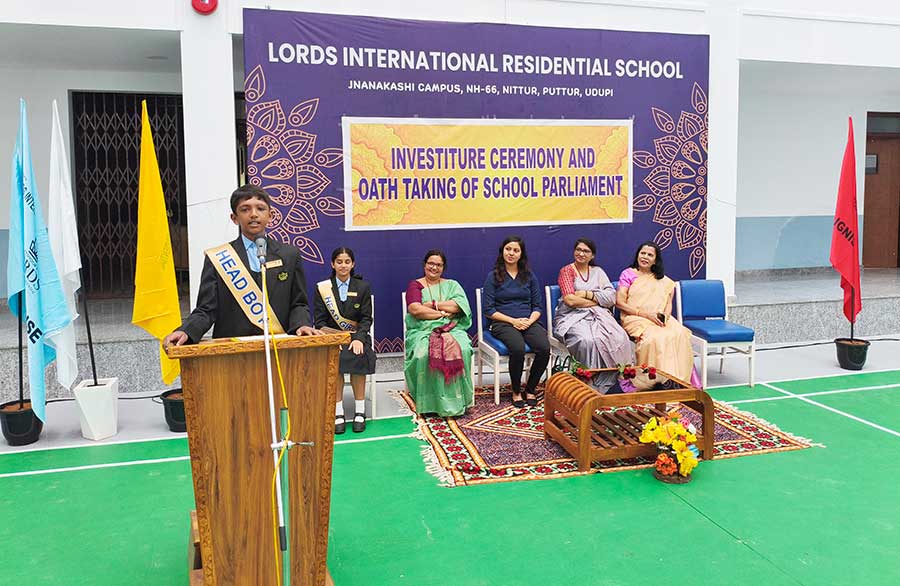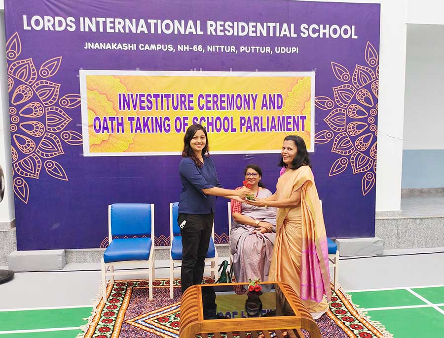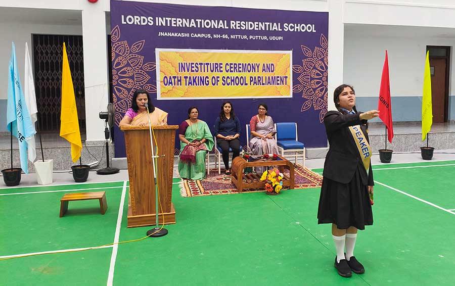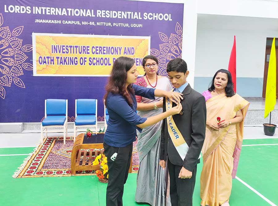 LORDS INTERNATIONAL RESIDENTIAL SCHOOL proudly hosted its first School Investiture Ceremony on 8th August 2025 at 9:30 AM in the school premises. The event was graced by the esteemed presence of Mrs. Thanuja Maben as the Chief Guest, along with Dr. Mrs. Bhavyashree Kidiyoor (Trustee), Principal Ms. Myrtle L F. Lewis, and Vice Principal Mrs. Roopa Ashok Shetty, who presided over the ceremony.