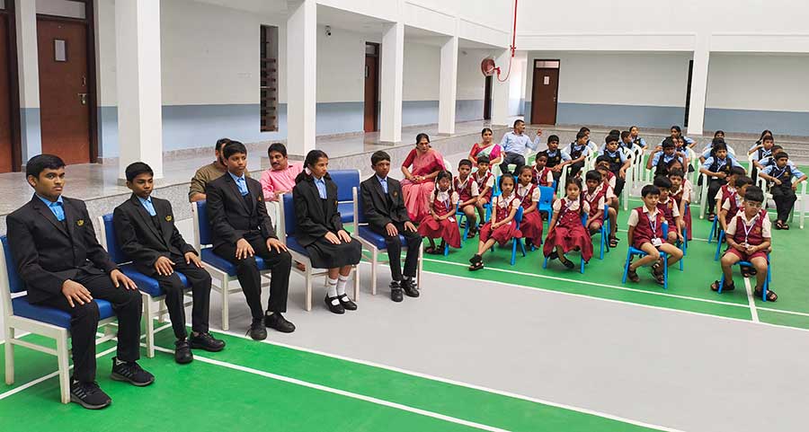 Following this, the student leaders—Speaker Yuthika, Head Boy Parikshith, Head Girl Pavani, and the House Leaders: Hayath (Aqua House), Rushangi (Ignis House), Thanmay (Terra House), and Hiba (Ventus House),discipline leader Yuvraj, Science leader Kanishk, Sports leader Shrinik—marched forward with their school and house flag towards their designated posts in a symbolic gesture of responsibility and leadership.